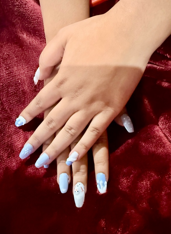 With the same patience and precision she applies to her studies, she prepares the nails by gently pushing back the cuticles, filing them evenly, and applying a thin base coat. Then, using the classic three-stroke method, she paints each nail in thin, even layers, one stroke on each side and a final sweep down the center. She finishes with a protective top coat, carefully sealing the tips, and allows the nails to dry completely, often using a fan to speed the process.