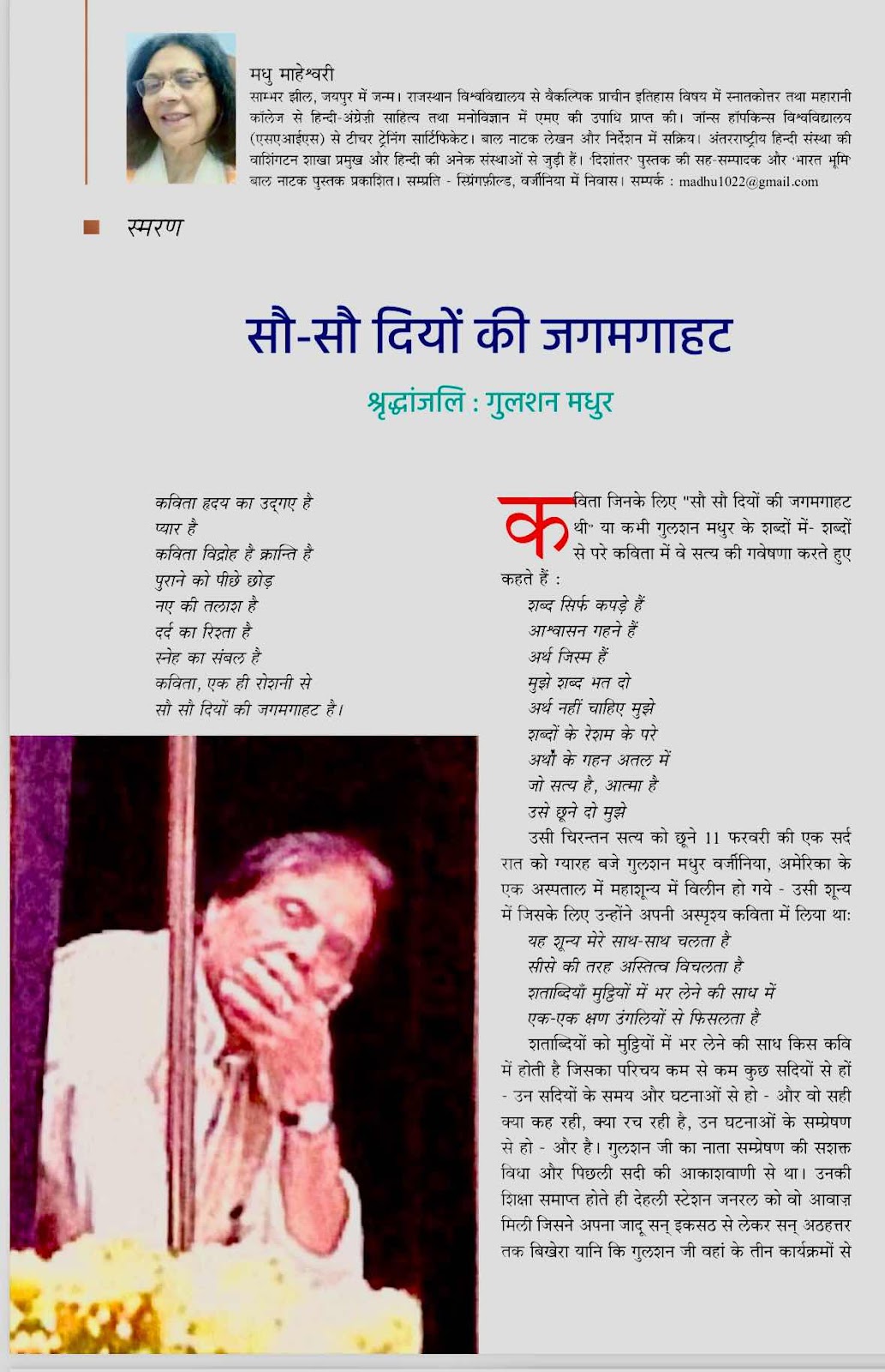 I was a literary friend of Gulshan Ji and we have co-edited a First Hindi Anthology in the USA which has been used in many prestigious universities’s courses. When I was a chair person of the International Hindi Association then I have formed a committee to organize Kavi Sammelans and he was in that committee!