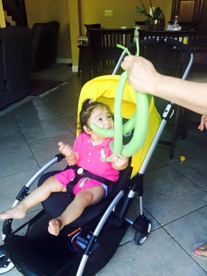 As she clutches the cucumber, she calls it "Bun Nanas," her version of "bananas." At just a year old, Geet is still learning to differentiate between the shapes and textures of different fruits and vegetables. Her excitement is endearing, a sweet reminder of the simple joys and curiosities of childhood, where the world is still full of delightful surprises.