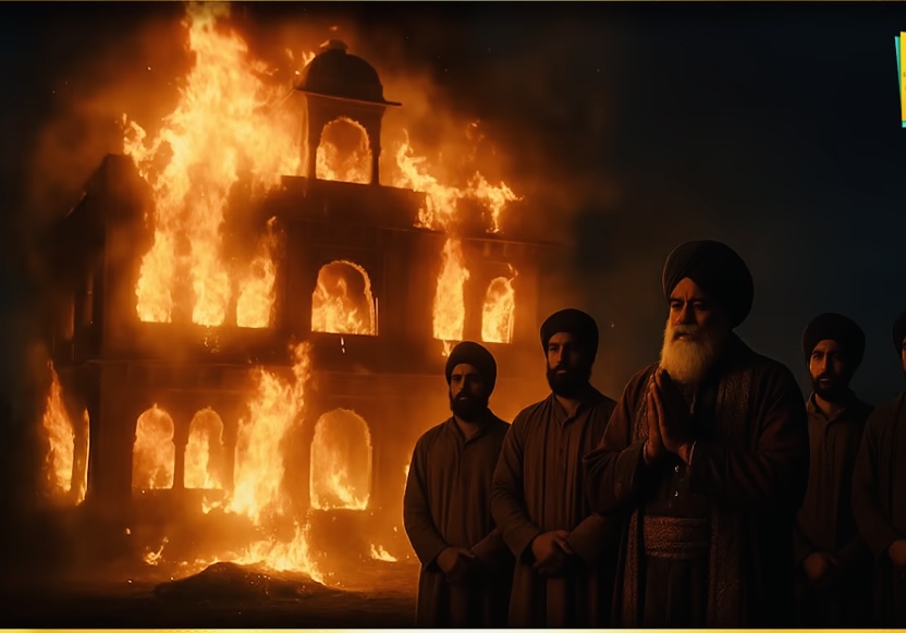 An image where when Guru Teg Bahadur ji’s body was secretly recovered and cremated wth a Master Plan, while his sacred sweared head was smartly recovered and carried to his home in Anandpur Sahib