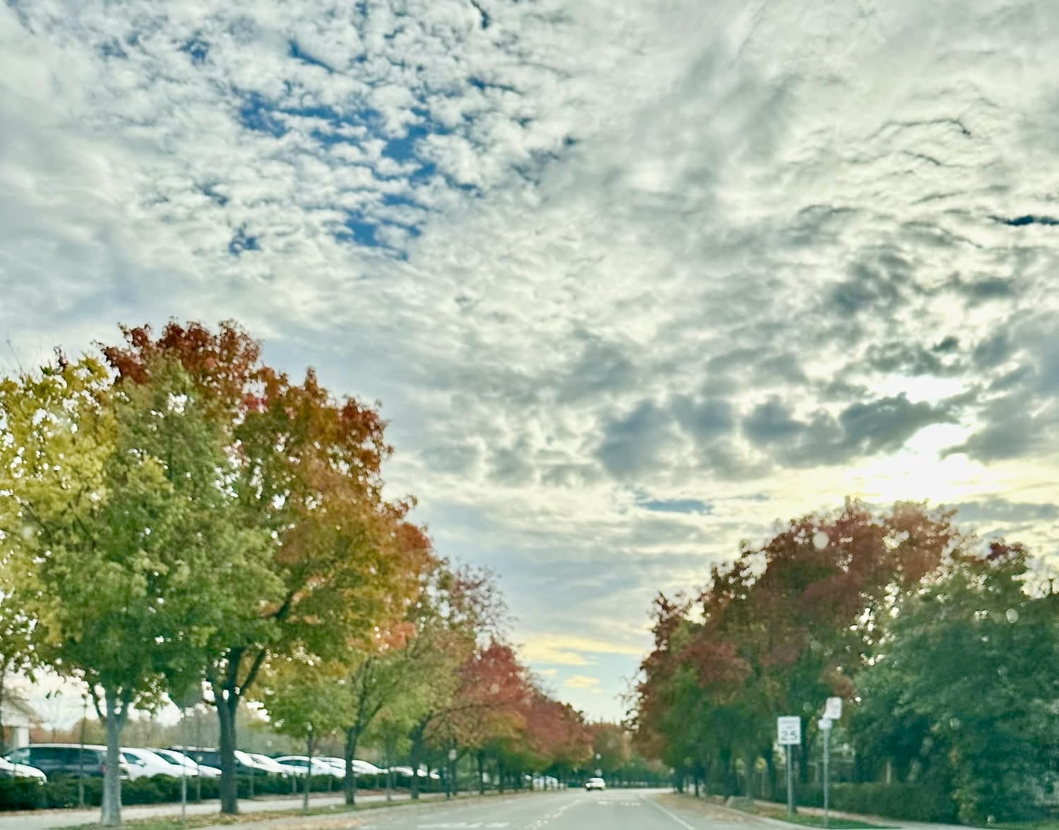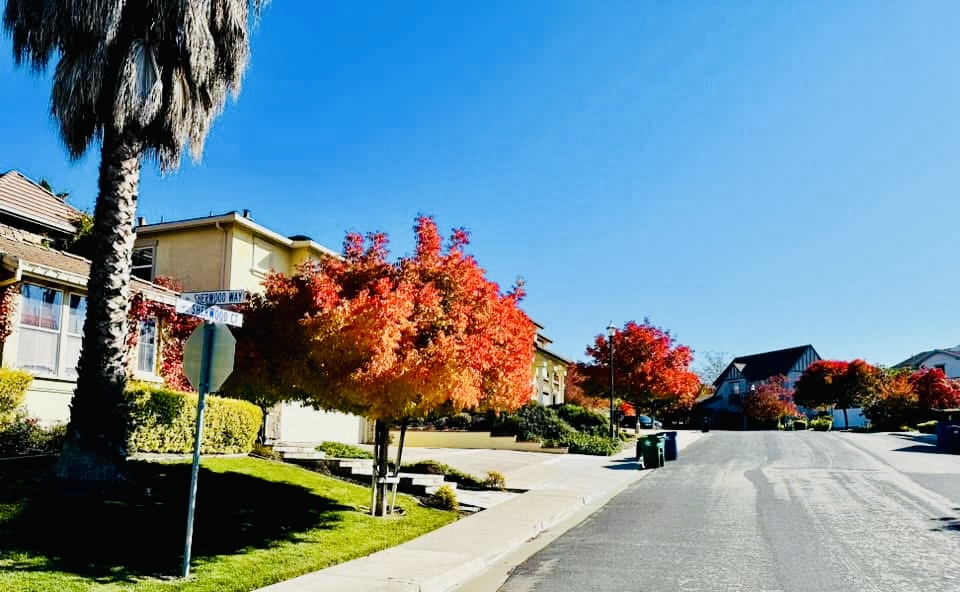 Fall in Sherwood Court feels nothing short of enchanting. The row of Chinese pistachio trees, six or seven of them—ignite the street with shades of crimson and deep blood-red, as if the season has painted them by hand.